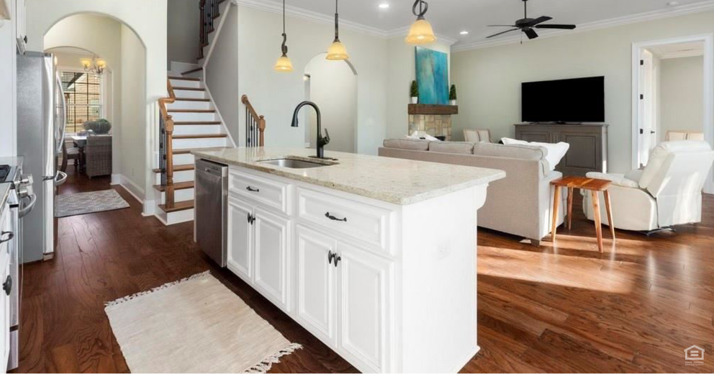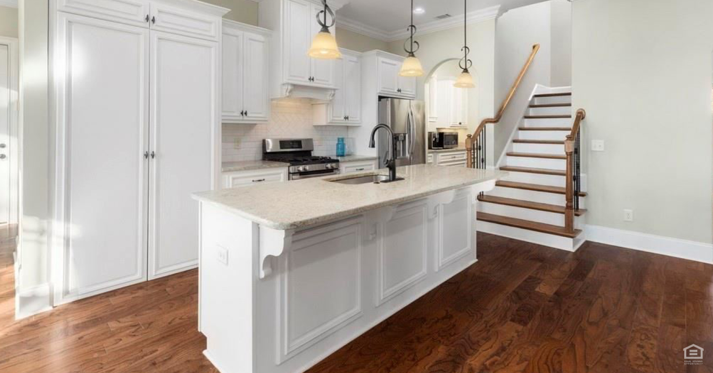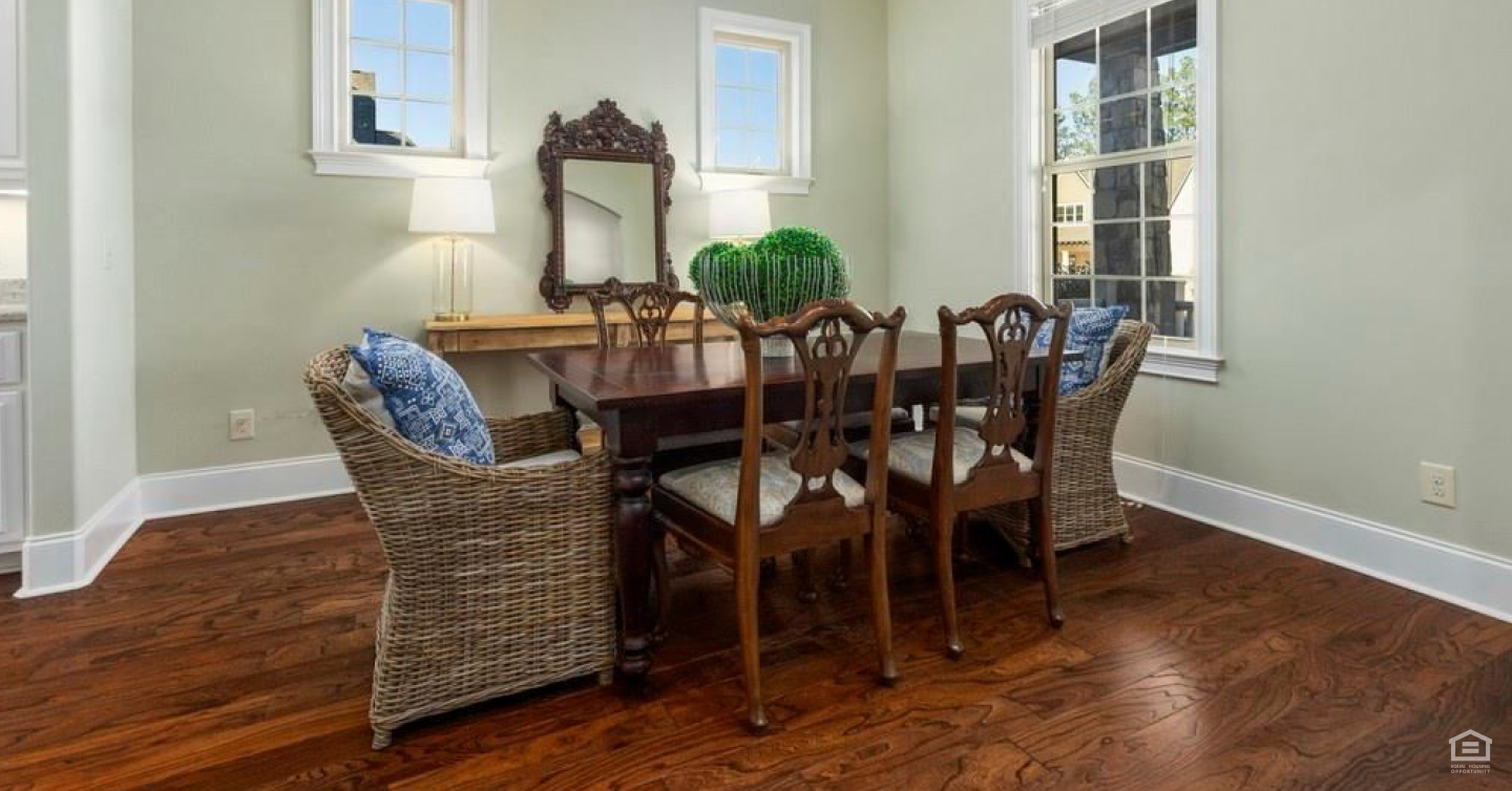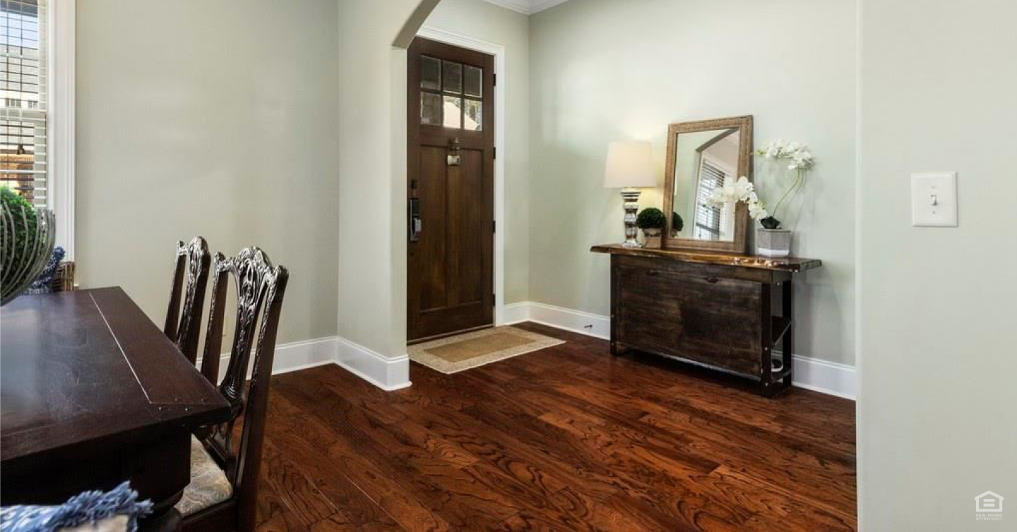 Upon entry, you’re greeted by warm wood floors and a classic archway that leads to the formal dining area and a foyer. The dining area flows into a delightful butler’s pantry, which connects to the kitchen.