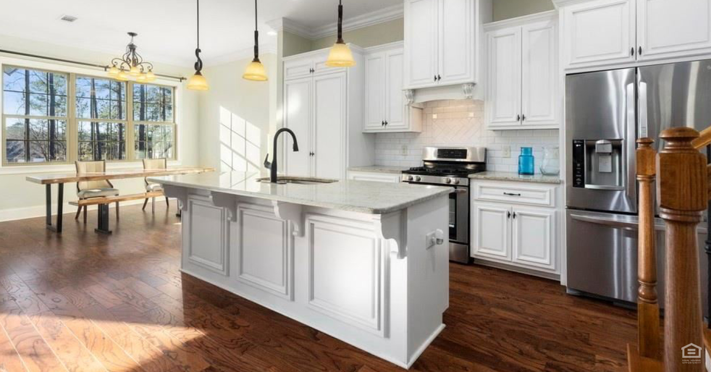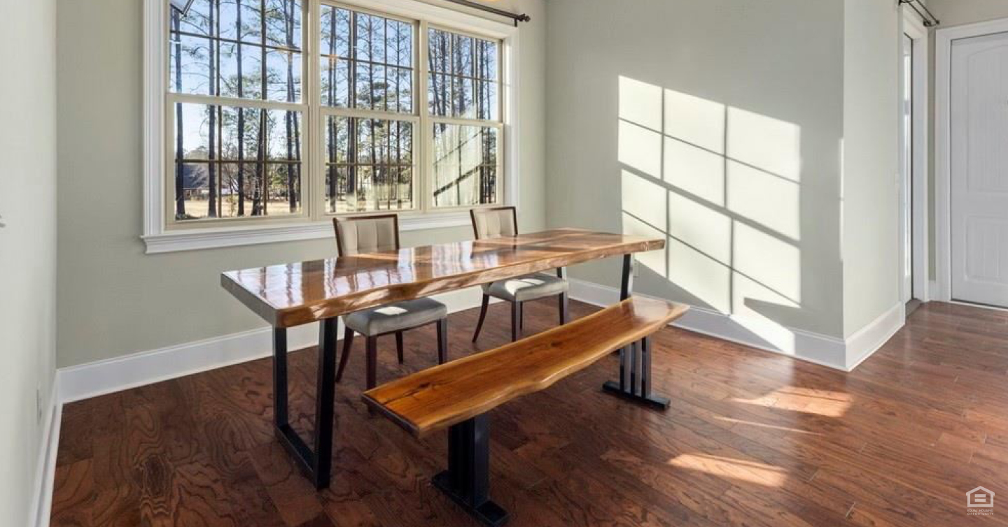 The kitchen features a large island, plenty of working space and a breakfast nook. From the kitchen to the main living area, natural light fills the home with lots of windows and nice views.