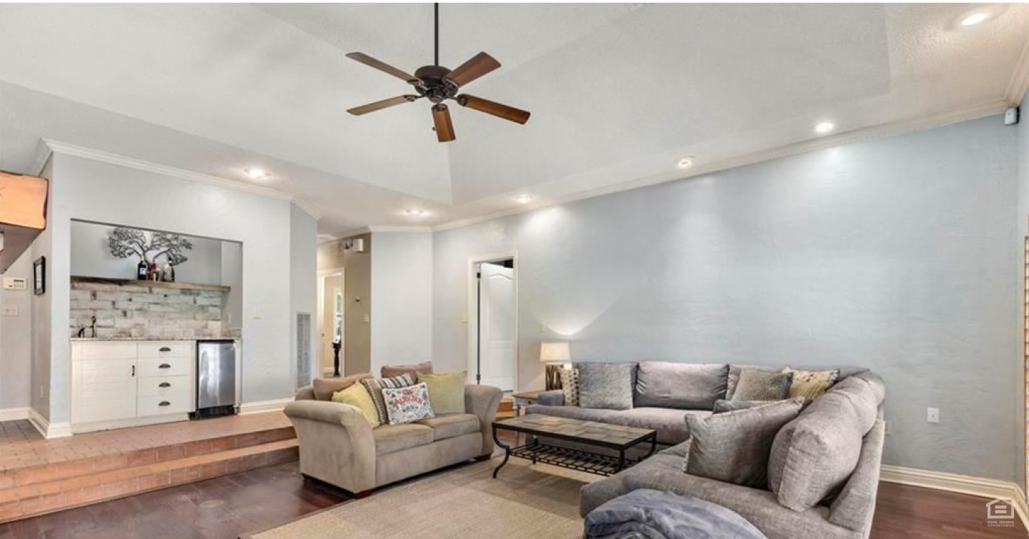 Circle back to a wet bar with icemaker before checking out the primary suite, complete with vaulted ceilings, double sinks and a grand en-suite bath. Two additional bedrooms in this area of the home share a full bath, and the laundry room is located conveniently in this wing as well.