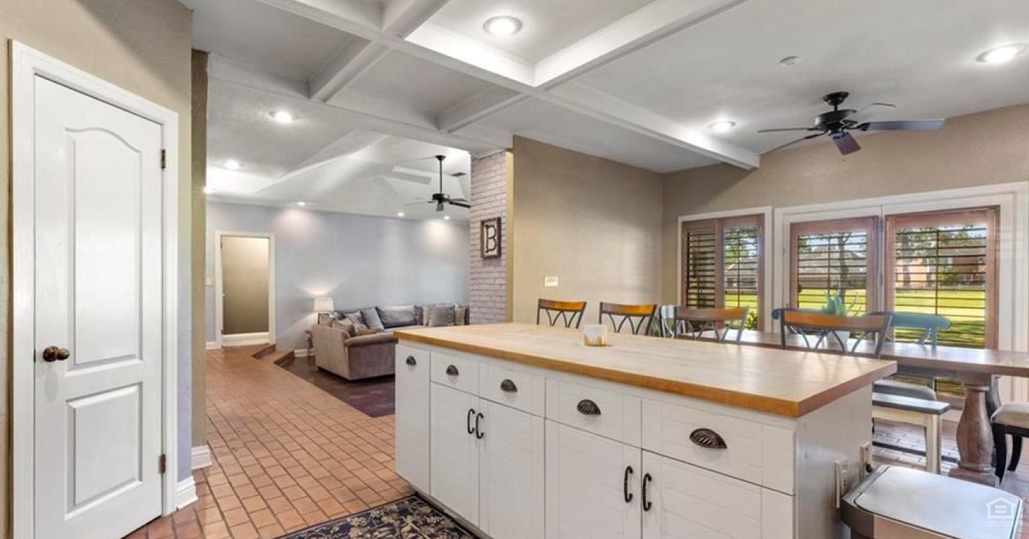 Inside, the floor plan impresses with an open living room with gas fireplace flowing easily into the kitchen and dining/breakfast area. The kitchen’s got character with its butcher-block island, stainless steel appliances, brick pavers and plantation shutters, which extend throughout most of the home.