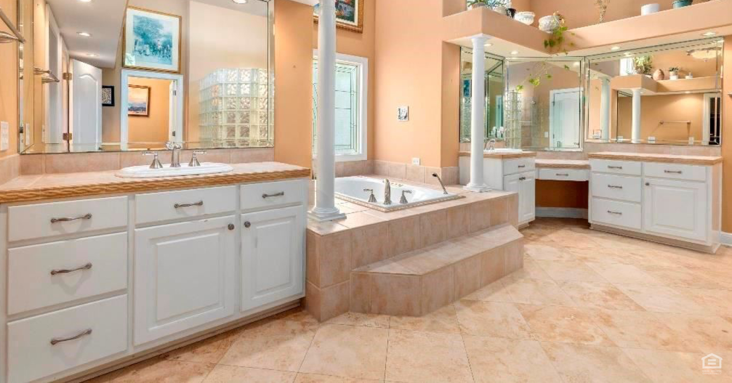 - Primary suite bathroom with two separate vanities and soaking tub.