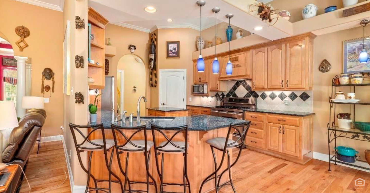 Some of the biggest draws include its stainless-steel appliances and gas top stove. Plus, there’s lots of cabinet and counter space, along with bar seating. There’s also a butler’s pantry to make food preparation even easier.