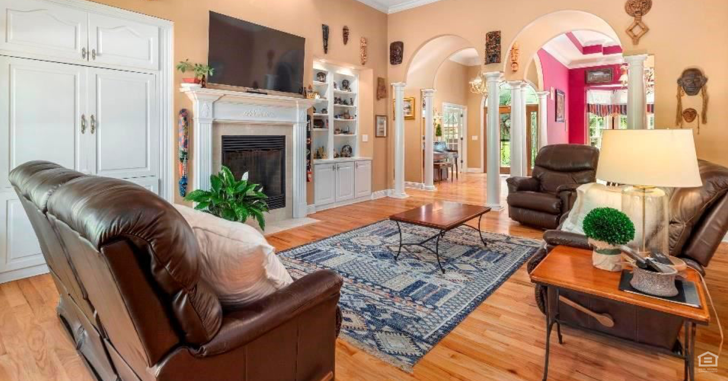 We’ll kick off our interior tour with a look at the arched entryways and grand ceilings. Next, we’ll head over to the living room. It has its own special touches, like a fireplace and built-ins.