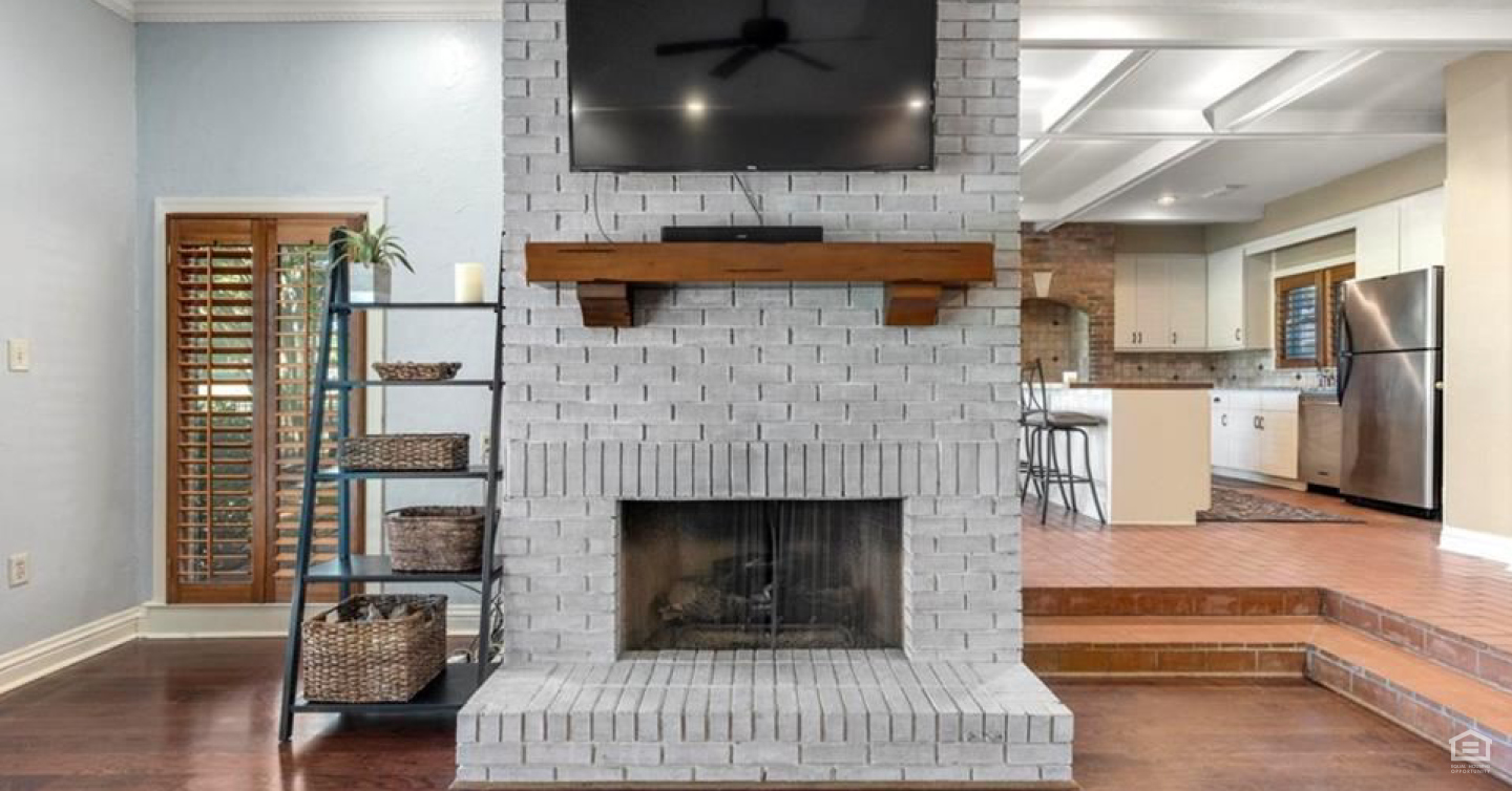 Once inside, the open living room with a gas fireplace flows easily into a kitchen full of character.