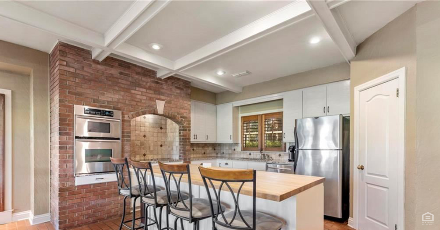 The kitchen features brick pavers, pretty arches, stainless steel appliances and a butcher-block island with bar seating.