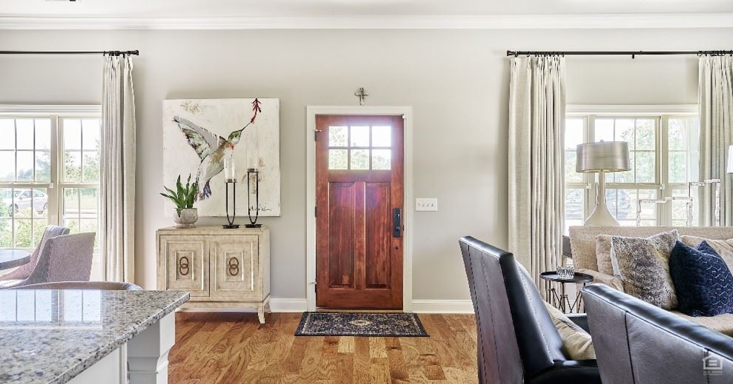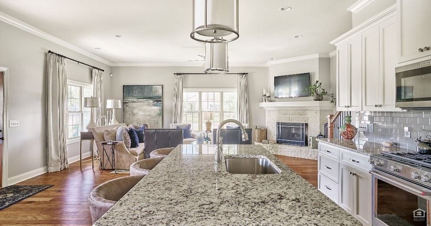 Upon entering the home, you are greeted with an open floor plan showing off both the comfortable living area and the impressive kitchen.