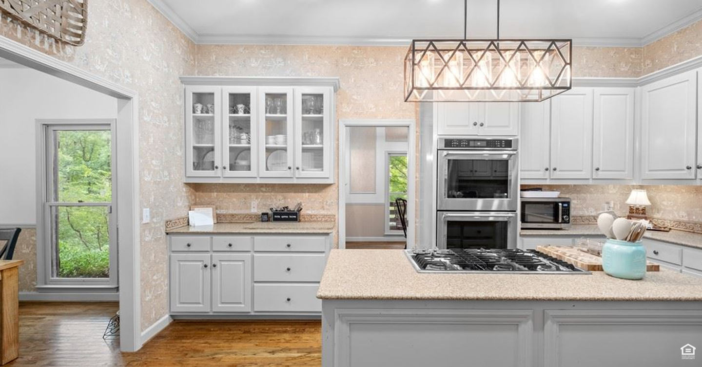 - Gourmet kitchen with a double ovens and custom cabinetry.