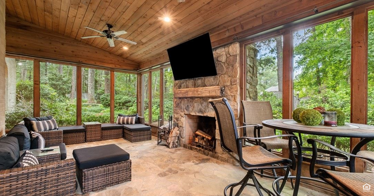 Outside, the allure continues with a screened porch, complete with a wood-burning fireplace that allows for comfortable year-round enjoyment. The beautifully landscaped backyard creates a personal oasis. Featuring a built-in grill, a fire pit and mature greenery, it provides an idyllic setting for quiet nights under the stars or lively gatherings with loved ones.