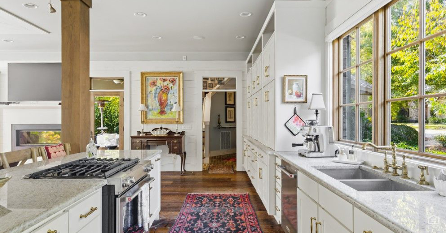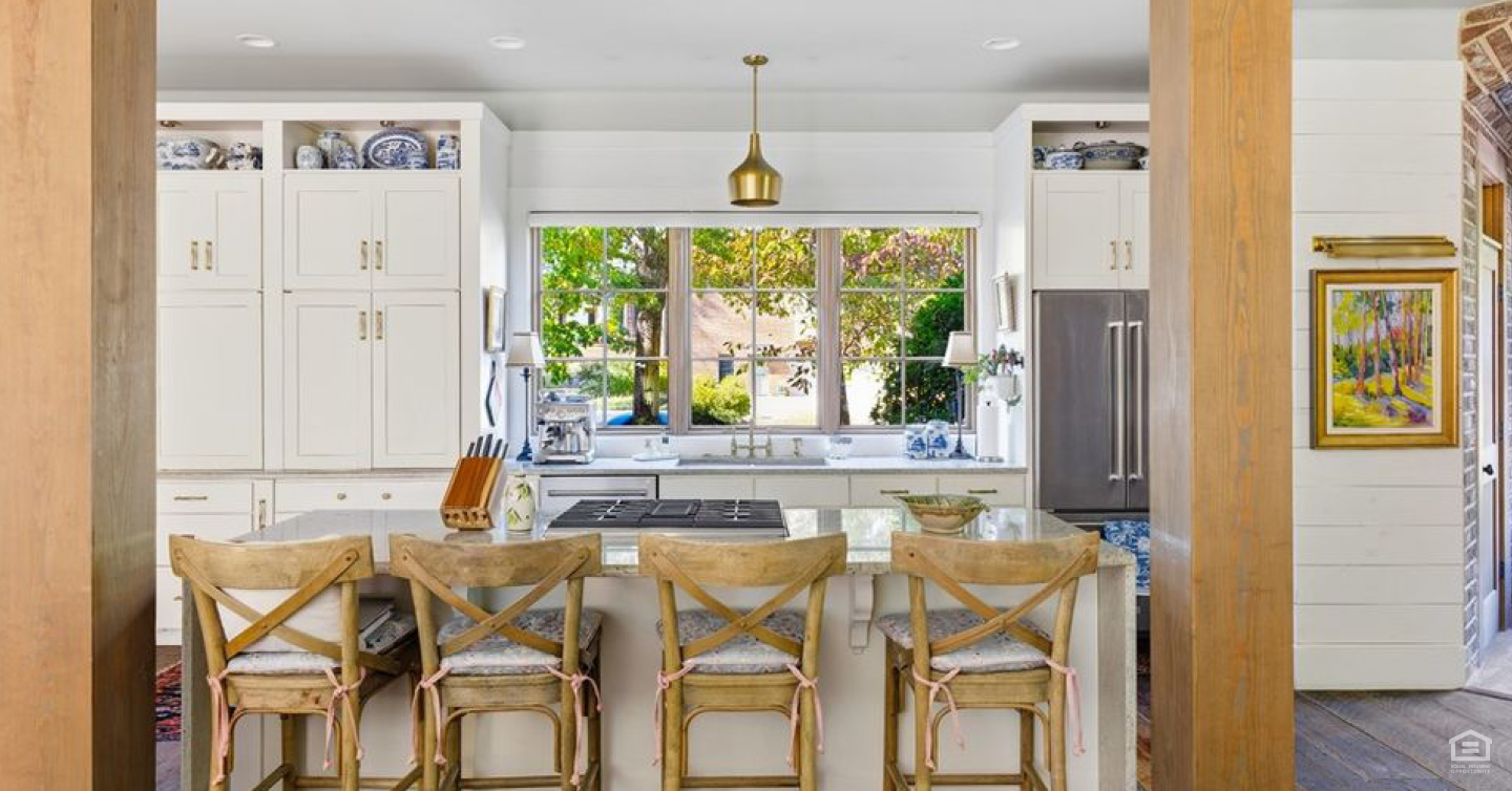 Imagine reclaimed 1860s heart pine flooring underfoot, with walls of windows inviting natural light into every corner. The kitchen is designed with style and functionality in mind, featuring waterfall granite, new KitchenAid appliances and smart storage solutions, such as appliance garages and a mixer lift.