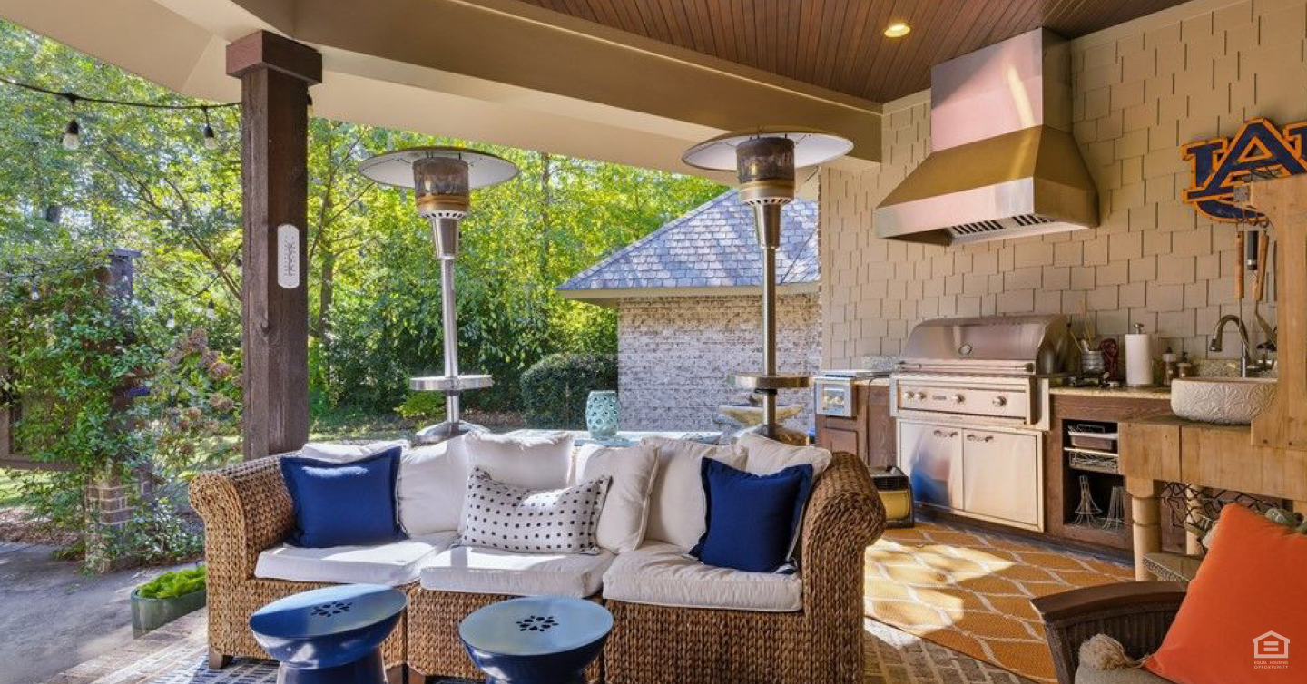 - Outdoor living with a covered patio and built-in grill.